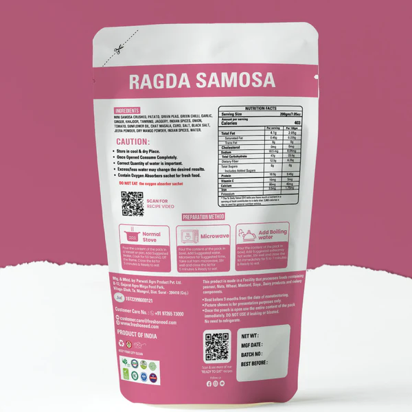 Relish the irresistible taste of Indian street food with our Ready to Eat Ragada Samosaโa beloved chaat dish featuring a crispy samosa drenched in warm, mildly spiced ragada (white pea curry), and garnished with chutneys and spices. It offers a perfect mix of tangy, spicy, and savory flavors in every bite.